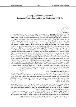تتناول الوثيقة أسلوب بيرت (PERT) لإدارة المشاريع، الذي تم تطويره في عام 1957 لمواجهة تحديات تطوير الصواريخ النووية. يركز الأسلوب على تقدير أوقات الأنشطة باستخدام ثلاثة تقديرات (التفاؤلي، الأكثر احتمالاً، والتشاؤمي) لحساب متوسط الوقت والتباين. يتم تحليل المسار الحرجي للمشاريع لتحديد الاحتمالات الزمنية والإدارة الفعالة للموارد.