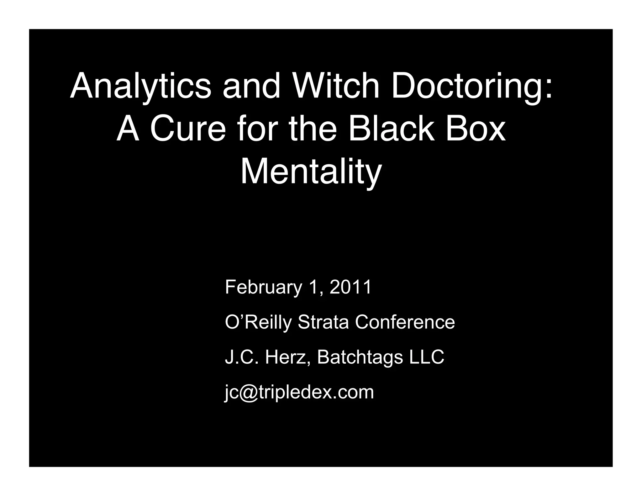 Organizations often treat analytics as a "black box" without understanding how it works due to the technical nature of analytics and lack of transparency in algorithms and methods. Many projects fail because organizations jump into analytics without properly preparing their data, validating results, or planning how insights will be implemented and drive business changes. To successfully adopt analytics, organizations must ask critical questions about data quality, intended use cases, and consequences of results in order to focus efforts and avoid wasting resources on initiatives that do not provide value.