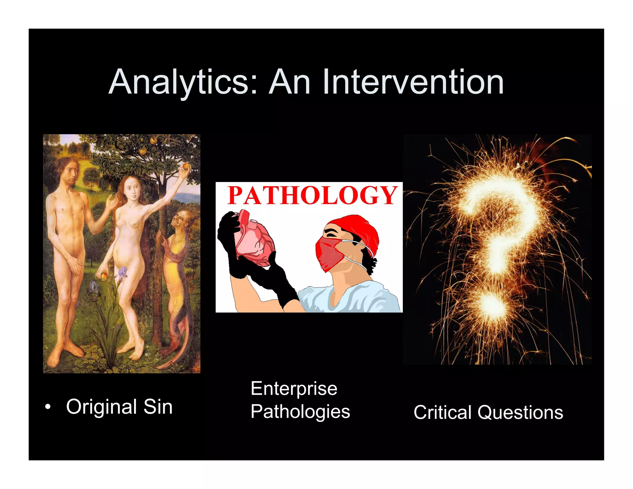 This document discusses common issues ("pathologies") that organizations face when adopting analytics and data-driven approaches. It summarizes these pathologies in 3 sentences or less: