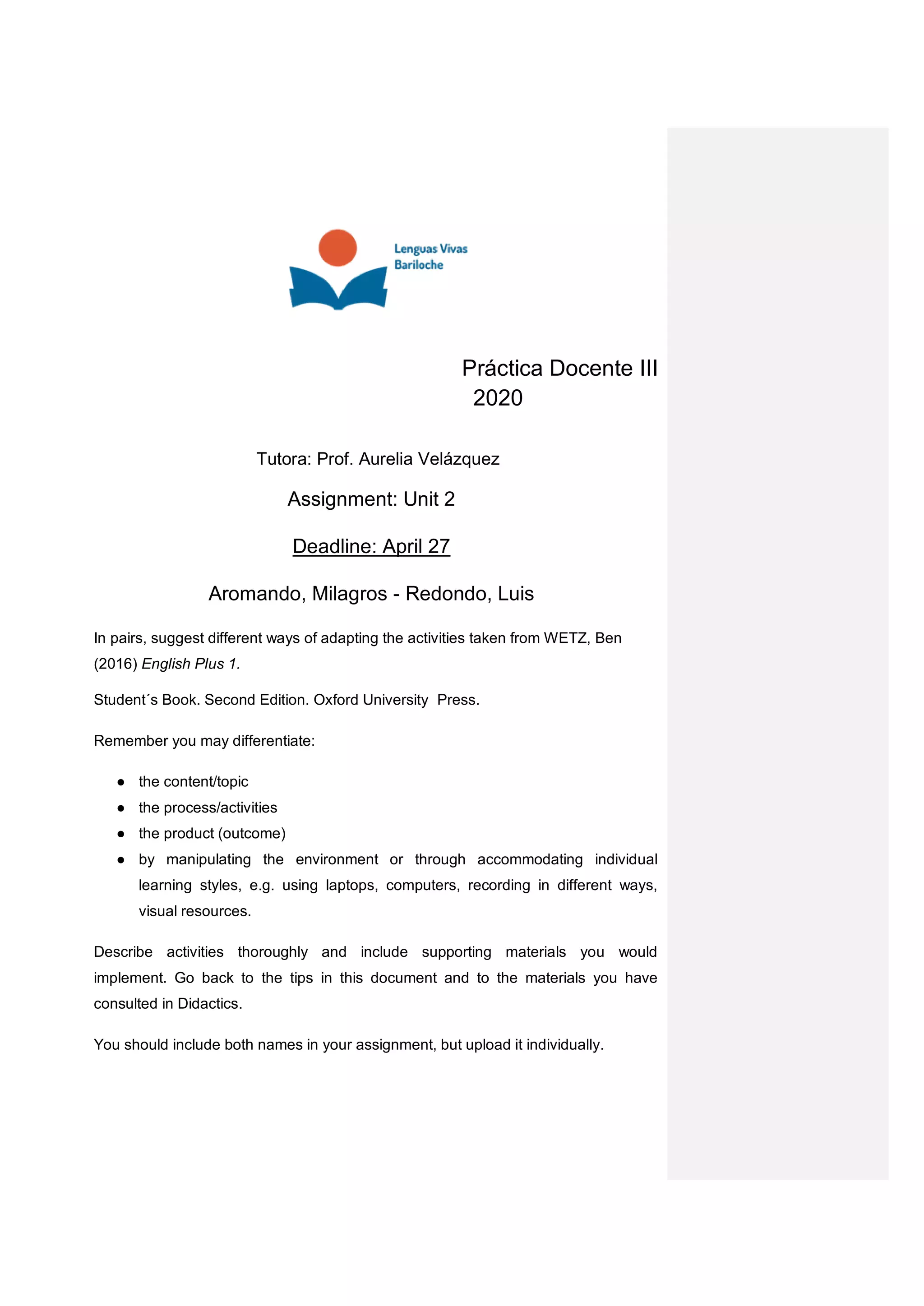 The document provides guidance for adapting classroom activities from an English textbook for a student with dyslexia. It suggests differentiating activities by content, process, product, environment, or learning style. For a reading activity, the teacher should use pre-reading aids like posters and help the student read aloud. Exercises can be adapted to use visuals, clear formatting and instructions, and dividing tasks into simpler parts. The adaptations aim to help the student learn at their own pace and style while keeping the same content as other students.
