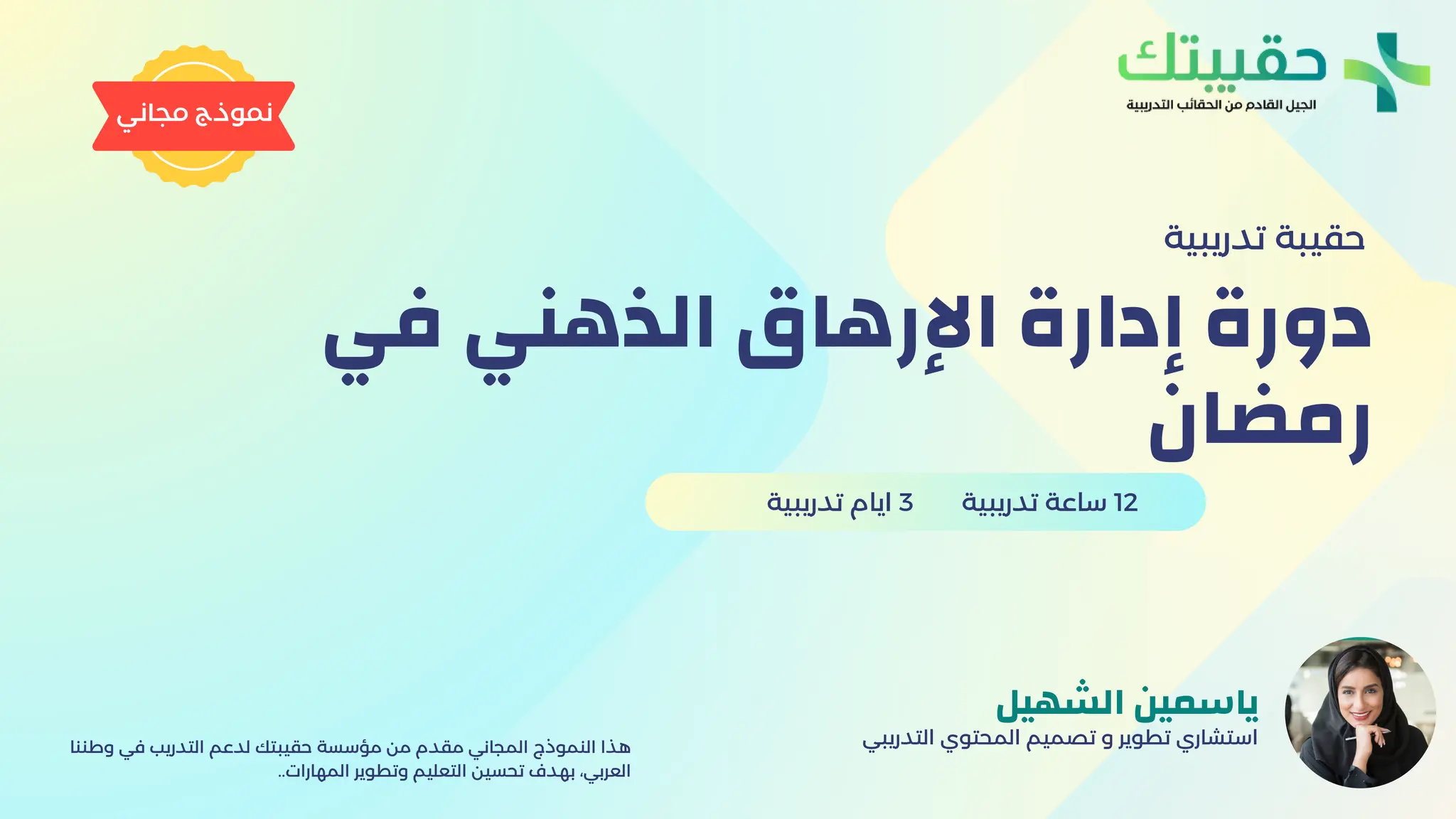 ‫وطننا‬ ‫في‬ ‫التدريب‬‫لدعم‬ ‫حقيبتك‬ ‫مؤسسة‬ ‫من‬ ‫مقدم‬ ‫المجاني‬ ‫النموذج‬ ‫هذا‬ ..‫المهارات‬ ‫وتطوير‬ ‫التعليم‬ ‫تحسين‬ ‫بهدف‬ ،‫العربي‬ ‫في‬ ‫الذهني‬ ‫اإلرهاق‬ ‫إدارة‬ ‫دورة‬ ‫رمضان‬ ‫تدريبية‬ ‫حقيبة‬ ‫التدريبي‬ ‫المحتوي‬ ‫تصميم‬ ‫و‬ ‫تطوير‬ ‫استشاري‬ ‫الشهيل‬ ‫ياسمين‬ ‫تدريبية‬ ‫ايام‬ 3 ‫تدريبية‬ ‫ساعة‬ 12 ‫مجاني‬ ‫نموذج‬