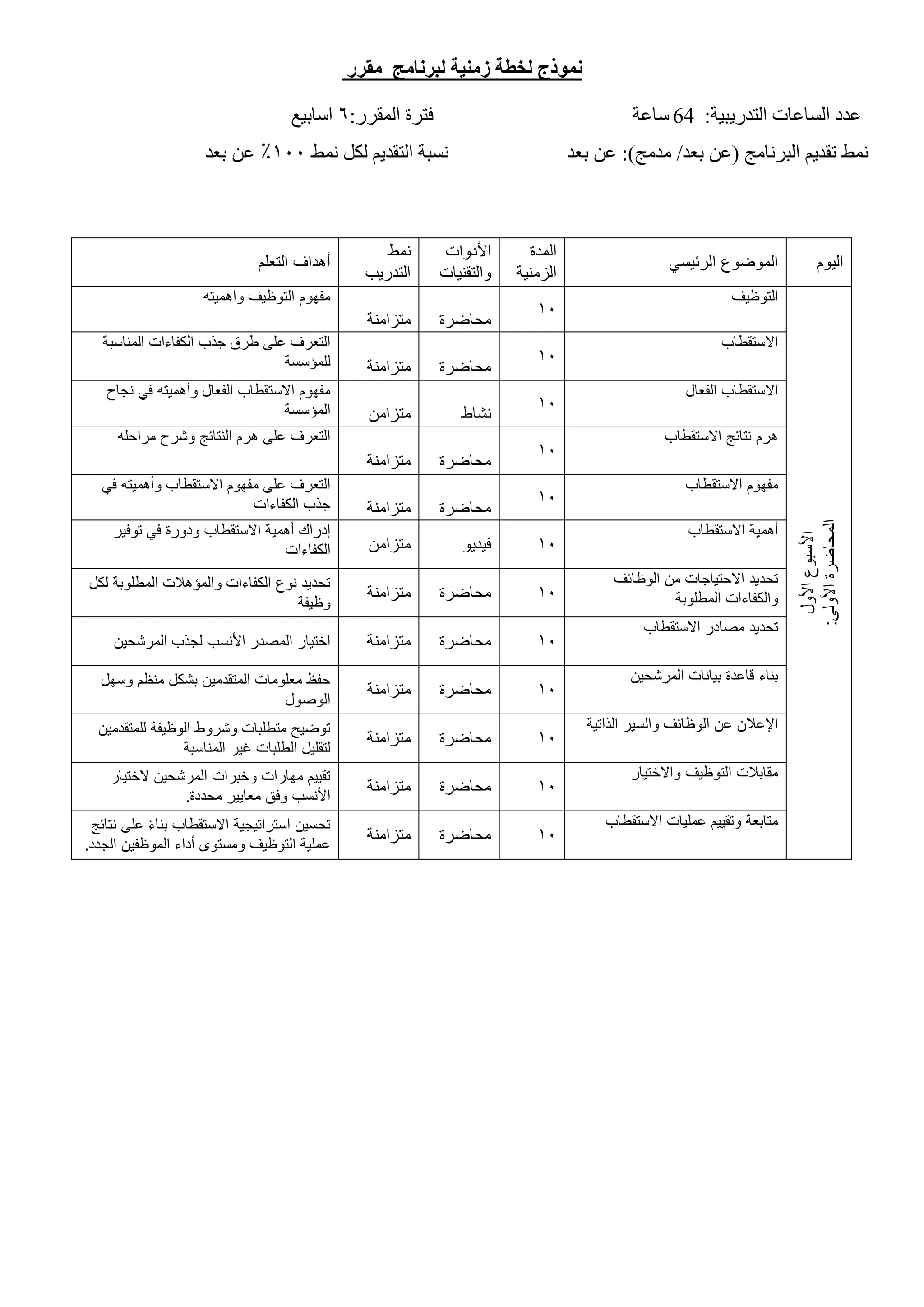 اختيار معايير تحديد 10 محاضرة متزامنة على ًءبنا للوظيفة األنسب اختيار ضمان محددة وخبرات مهارات . السابقة والخبرات الذاتية السير تحليل 10 محاضرة متزامنة بشكل للوظيفة المرشح مالءمة مدى تقييم ودقيق موضوعي . وتقنية سلوكية مقابالت إجراء 10 نشاط متزامن وأداء المشكالت حل على المرشح قدرات فهم المطلوبة المهام . المقيمين بين التقييم أساليب توحيد 10 محاضرة متزامنة الشخصي التحيز وتقليل التقييم عدالة ضمان . إدارة نظام في المالحظات تسجيل البشرية الموارد 10 محاضرة متزامنة إليها الرجوع يمكن دقيقة بيانات على الحفاظ الحاجة عند . المقابلة بعد للمرشح راجعة تغذية تقديم 10 فيديو متزامن صورة وتعزيز المرشح تجربة تحسين المنظمة . التوظيف بإجراءات االلتزام متابعة القانونية 10 محاضرة متزامنة أو قانونية مخالفات أي من المنظمة حماية تنظيمية . من العرض رفض أسباب تحليل المرشح 10 محاضرة متزامنة وزيادة المستقبلية العمل عروض تحسين القبول معدالت . في الجديد الموظف دمج برنامج تقديم الفريق 10 محاضرة متزامنة بيئة في الموظف اندماج تسريع وزيادة العمل إنتاجيته . بعد األداء مؤشرات مراجعة 3 - 6 أشهر 10 محاضرة متزامنة مالءمة ومدى التوظيف عملية نجاح مدى تقييم للوظيفة الموظف . وفق مخصصة تدريب برامج تصميم التقييم نتائج 10 محاضرة متزامنة القوة نقاط على ًءبنا الموظف مهارات تطوير والضعف المكتشفة . للموظف دائمة متابعة سجالت إنشاء 10 محاضرة متزامنة االستفادة وتحقيق الوظيفي التطور تتبع البشرية الموارد من القصوى .