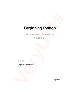 The document describes 'Beginning Python: From Novice to Professional', a comprehensive guide for learning Python programming available in PDF format. It covers Python's syntax, features, and advanced topics, supported by ten practical projects, making it suitable for both novice and intermediate programmers. Authored by experienced programmer Magnus Lie Hetland, the book emphasizes modern programming practices and is highly recommended for those seeking to understand Python.