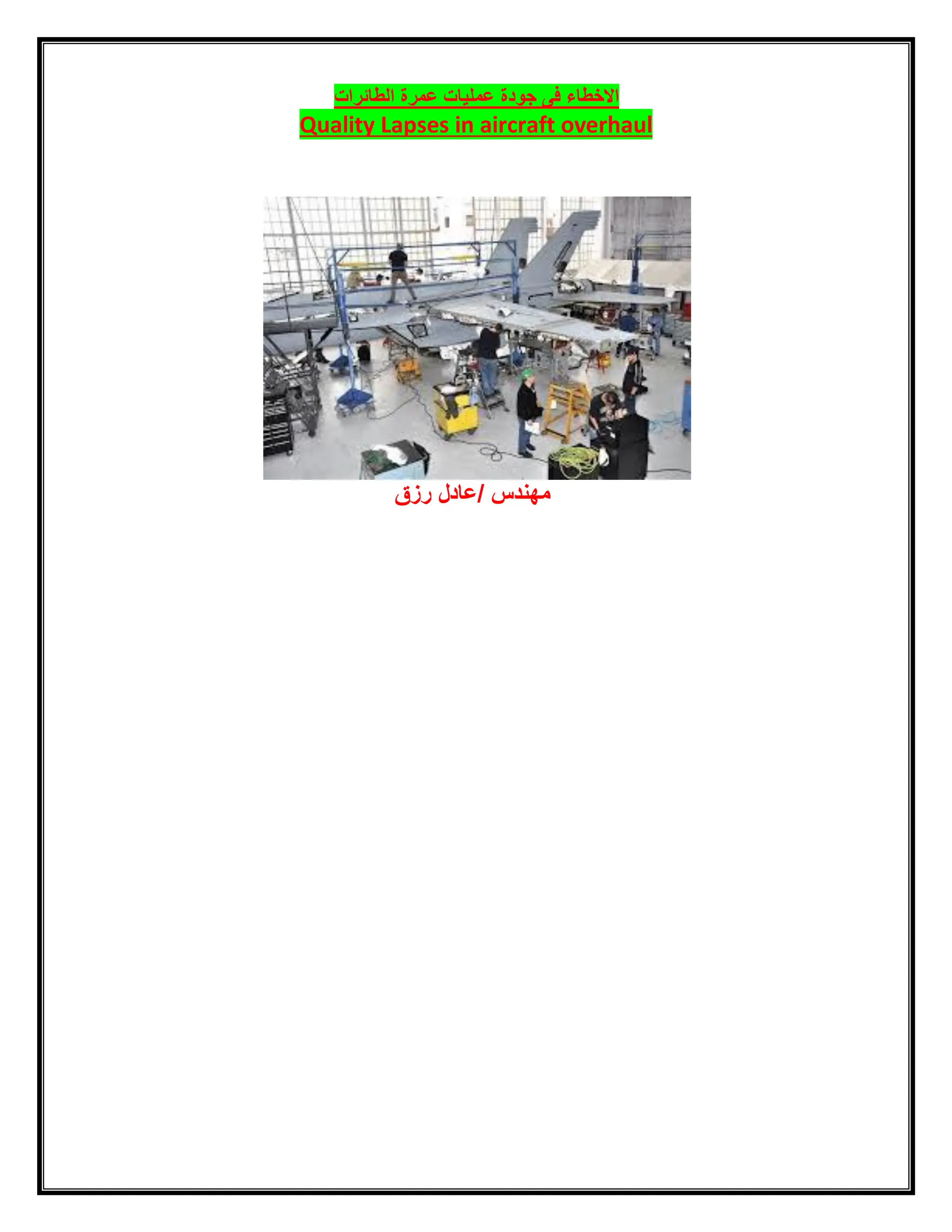 يتناول المستند الأخطاء المرتبطة بجودة عمليات عمرة الطائرات وكيفية تأثيرها على سلامة الطيران. يُظهر أن الأخطاء في عمليات عمرة الطائرات تمثل عاملاً مهماً في 17% من حوادث الطيران، مما يستدعي تحسين مستوى الفحص والتفتيش. يناقش المستند أيضًا العوامل البشرية التي تؤثر على كفاءة عمليات العمرة ويقترح طرقًا لتحسين الجودة.