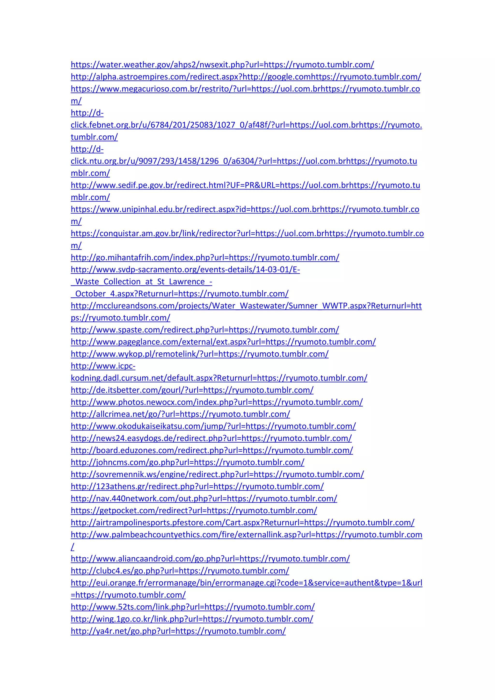 The document contains a list of over 100 hyperlinks redirecting to the same URL - https://ryumoto.tumblr.com/. The hyperlinks are from a variety of domains and some contain additional redirection links or parameters in the URL. All the links ultimately redirect to the same Tumblr page.