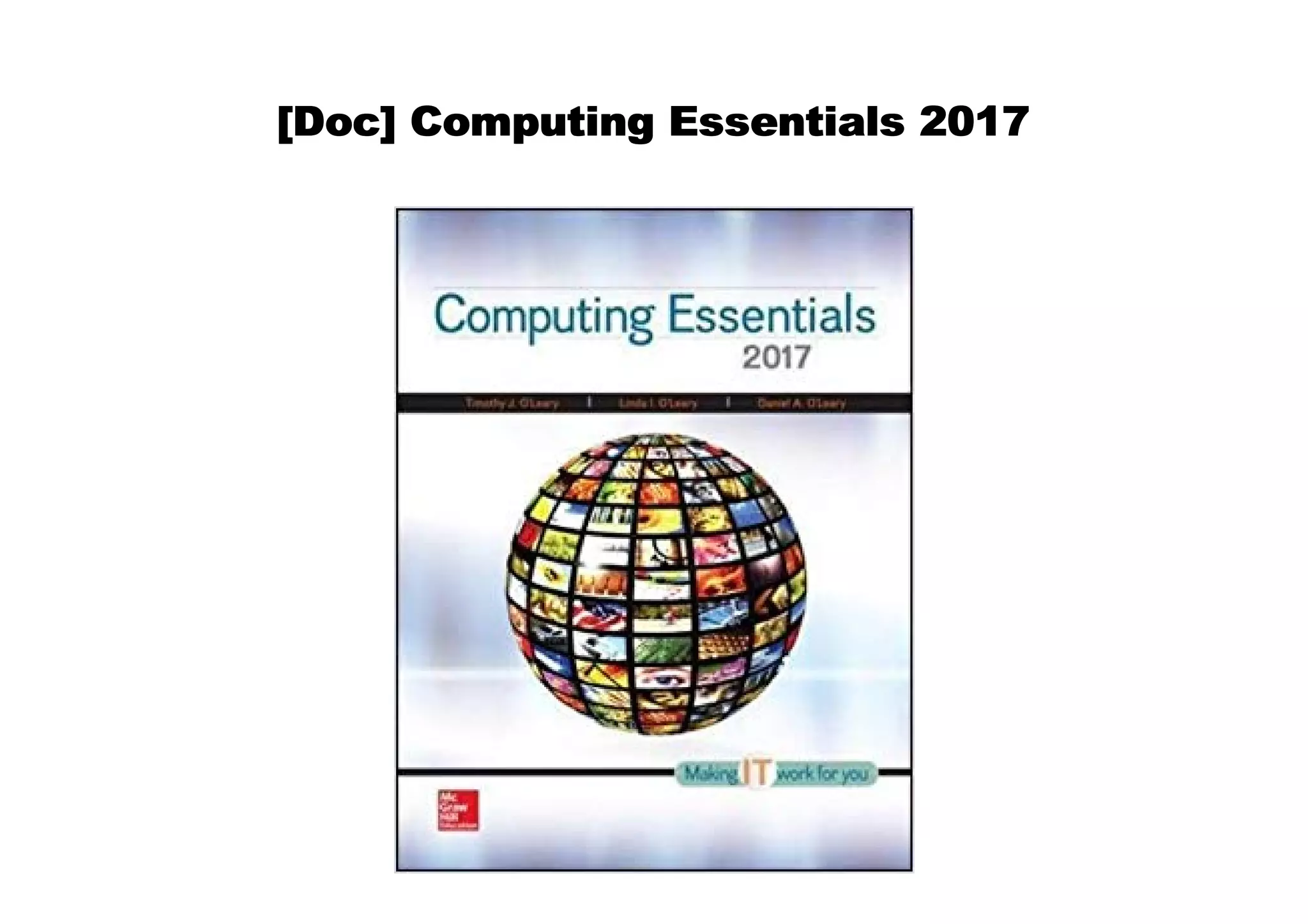 Computing Essentials 2017 provides an overview of important concepts in information technology. The 432-page paperback book published by McGraw-Hill Education in 2016 discusses how IT affects people, privacy, ethics and the environment using current examples. It also introduces Connect, an online teaching platform that helps students learn and instructors teach more effectively. The document promotes downloading the full book.