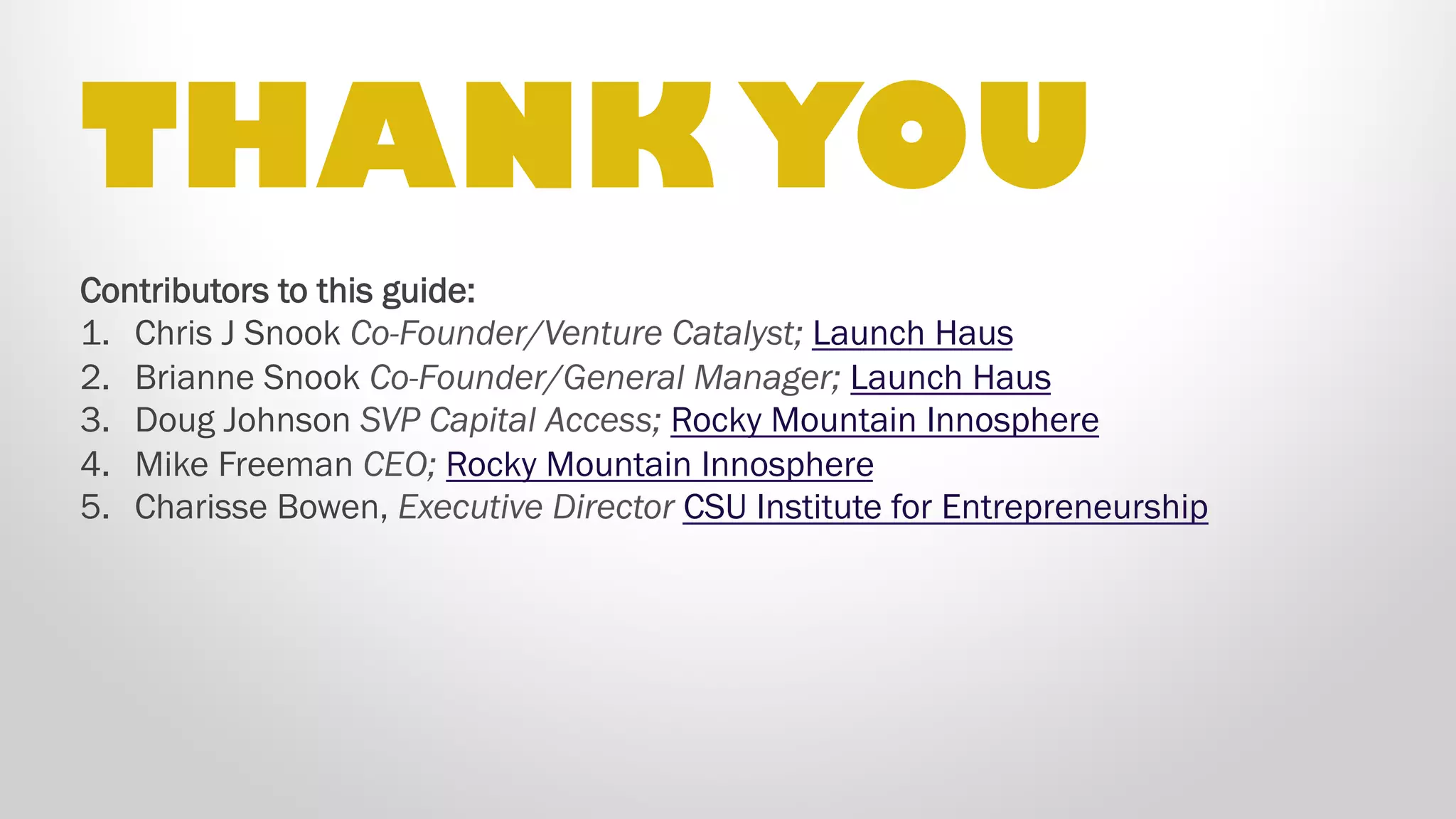 This document provides an overview of the startup scene in Fort Collins, Colorado. It begins with contributors to the guide and guidelines for amplifying results in the local ecosystems. It then covers an overview of why Fort Collins is a good place for startups, notable companies, movements, meetups/events, resources at Colorado State University, and sources of capital. Subsequent sections discuss incubators, prototype labs, venture capital funds, office space, co-working spaces, finding talent, and ways to get connected. The document concludes with sections on lifestyle activities and author profiles. The overall document serves as a guide to help newcomers integrate into the Fort Collins startup community.