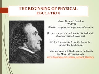 The document provides a history of physical education from its origins in the 18th century with Johann Basedow recognizing the importance of exercise and uniforms for students, to its development in the 19th and 20th centuries in America with figures like Charles Beck, Diocletian Lewis, and Dudley Sargent promoting physical education and developing exercises and equipment. It also outlines the changing focus of physical education from a emphasis on competition, skills, and physical fitness to a greater focus on health, cooperation, and lifelong activity.