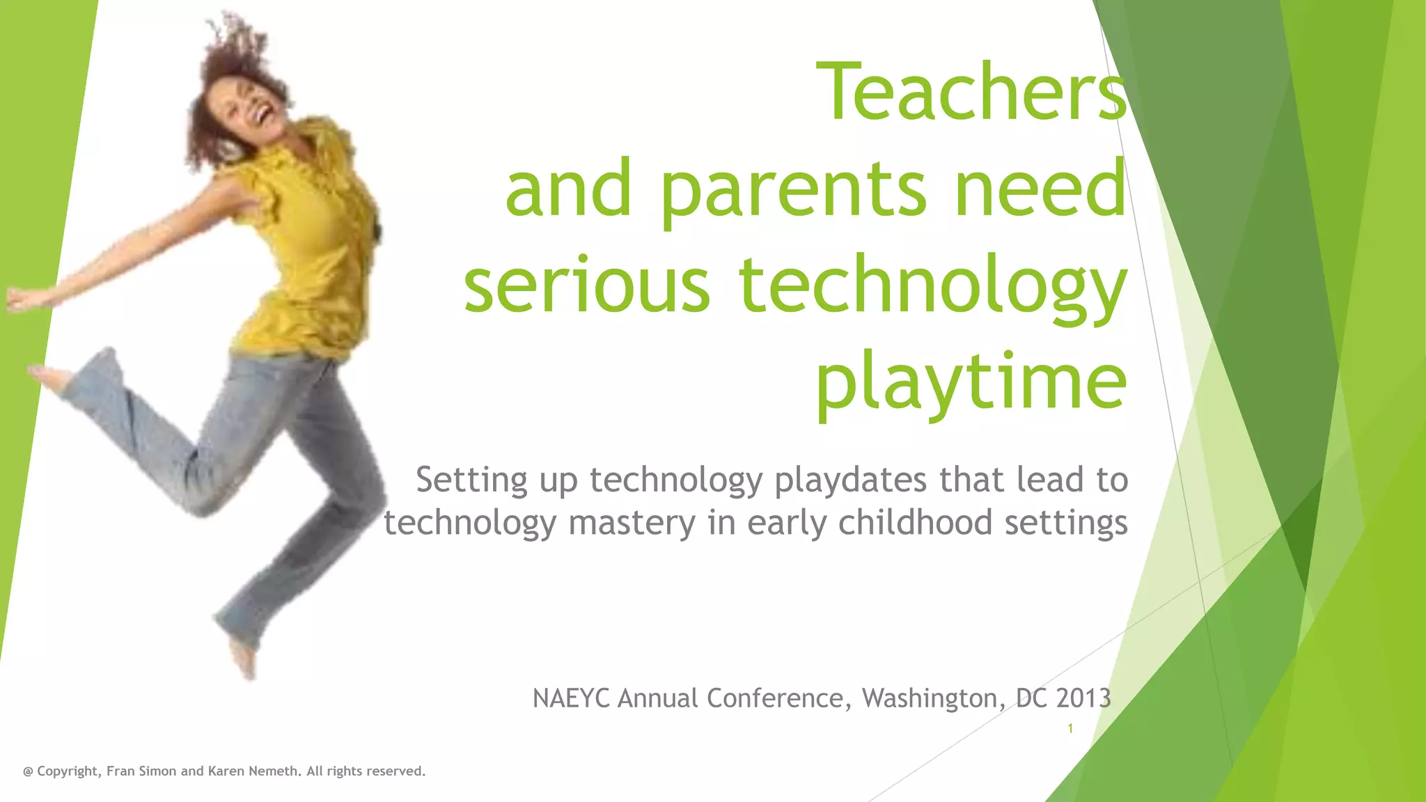 The document discusses the importance of technology playtime and professional development for teachers and parents. It notes that investments in technology are wasted without investments in helping adults learn how to use the tools. The rest of the document provides suggestions for setting up technology playdates and playspaces to give adults hands-on experience with educational technology. This includes identifying topics, planning activities, securing devices and space, and facilitating the sessions in a way that helps adults learn while having fun. The goal is to help adults gain skills with tools and understand how to integrate technology into early childhood settings.