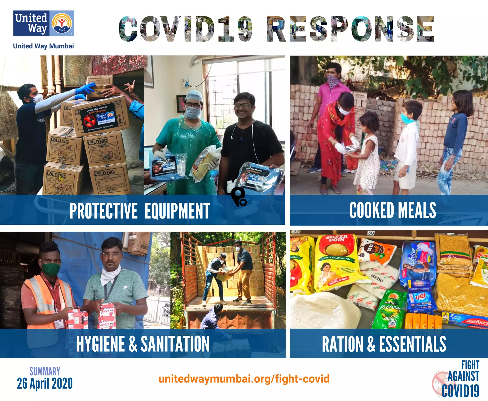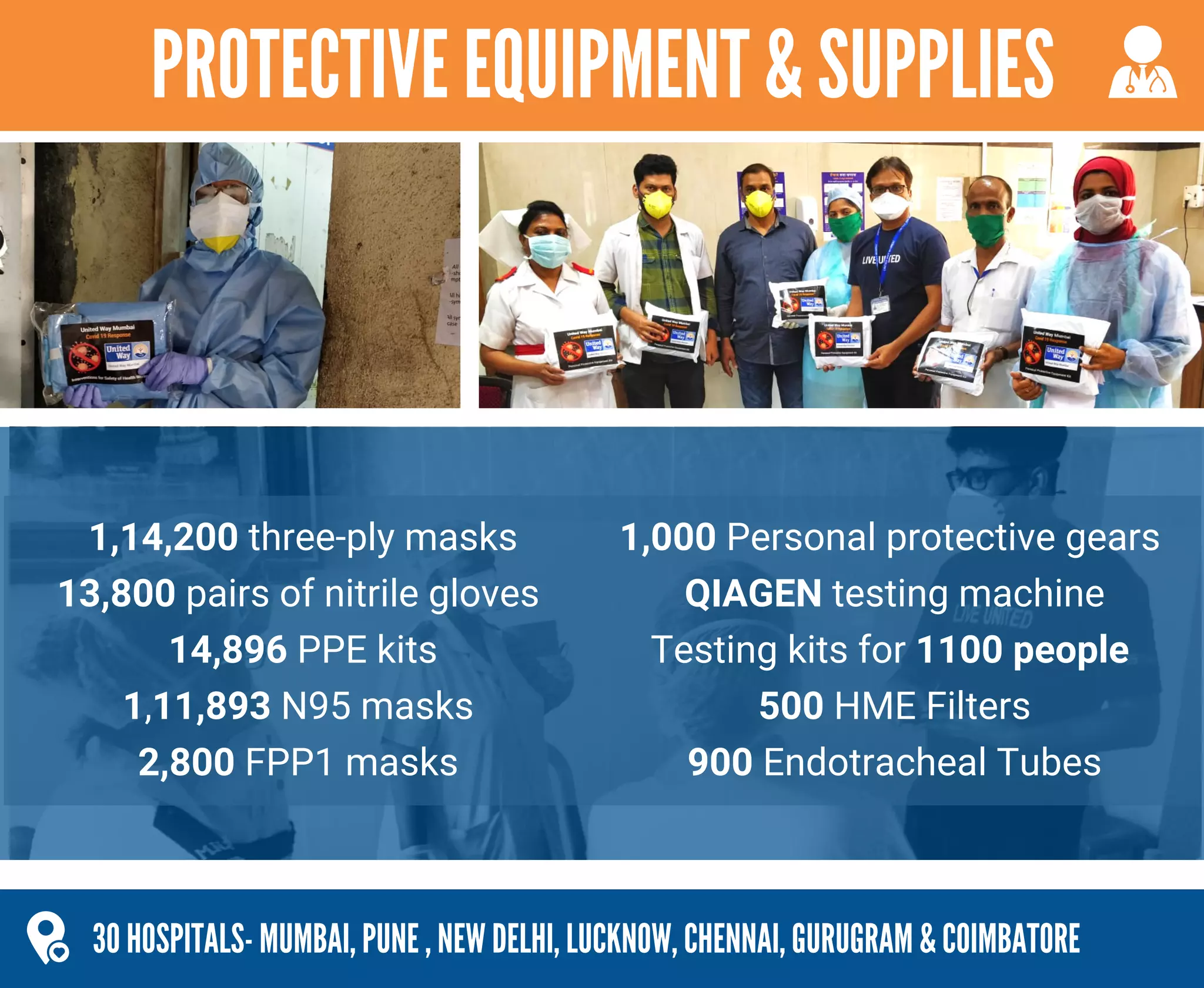 This document summarizes United Way Mumbai's efforts to fight COVID19 across 30 hospitals in 9 cities in India. It provided over 1 million pieces of protective equipment and supplies to hospitals. It distributed ration and essentials kits to over 4,916 families across 52 locations. It also served over 196,000 cooked meals across multiple cities. United Way Mumbai raised over 35 crores rupees to make these COVID19 relief efforts possible through donations from individuals, corporations, campaigns, and community partners.