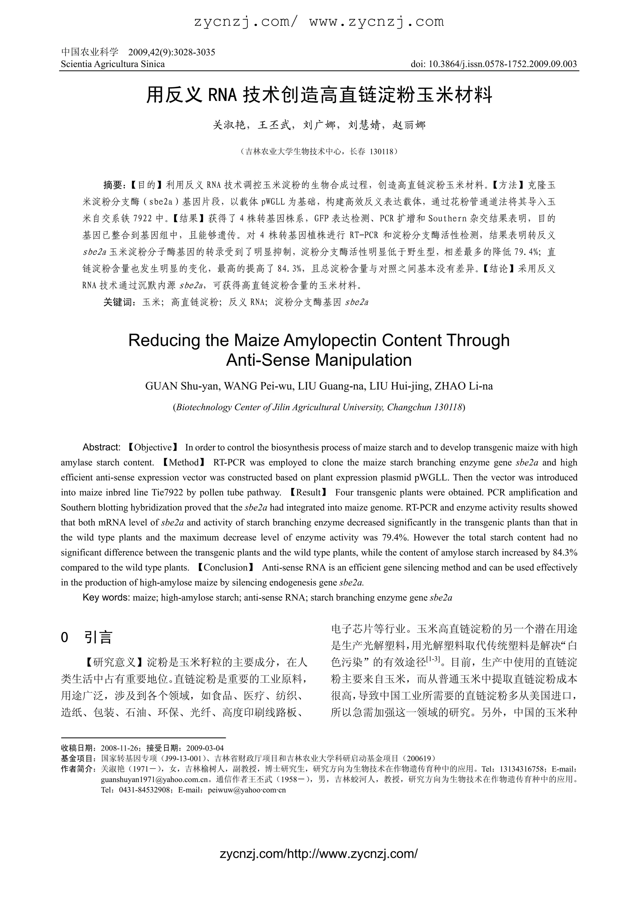 9期 关淑艳等:用反义 RNA 技术创造高直链淀粉玉米材料 3035
