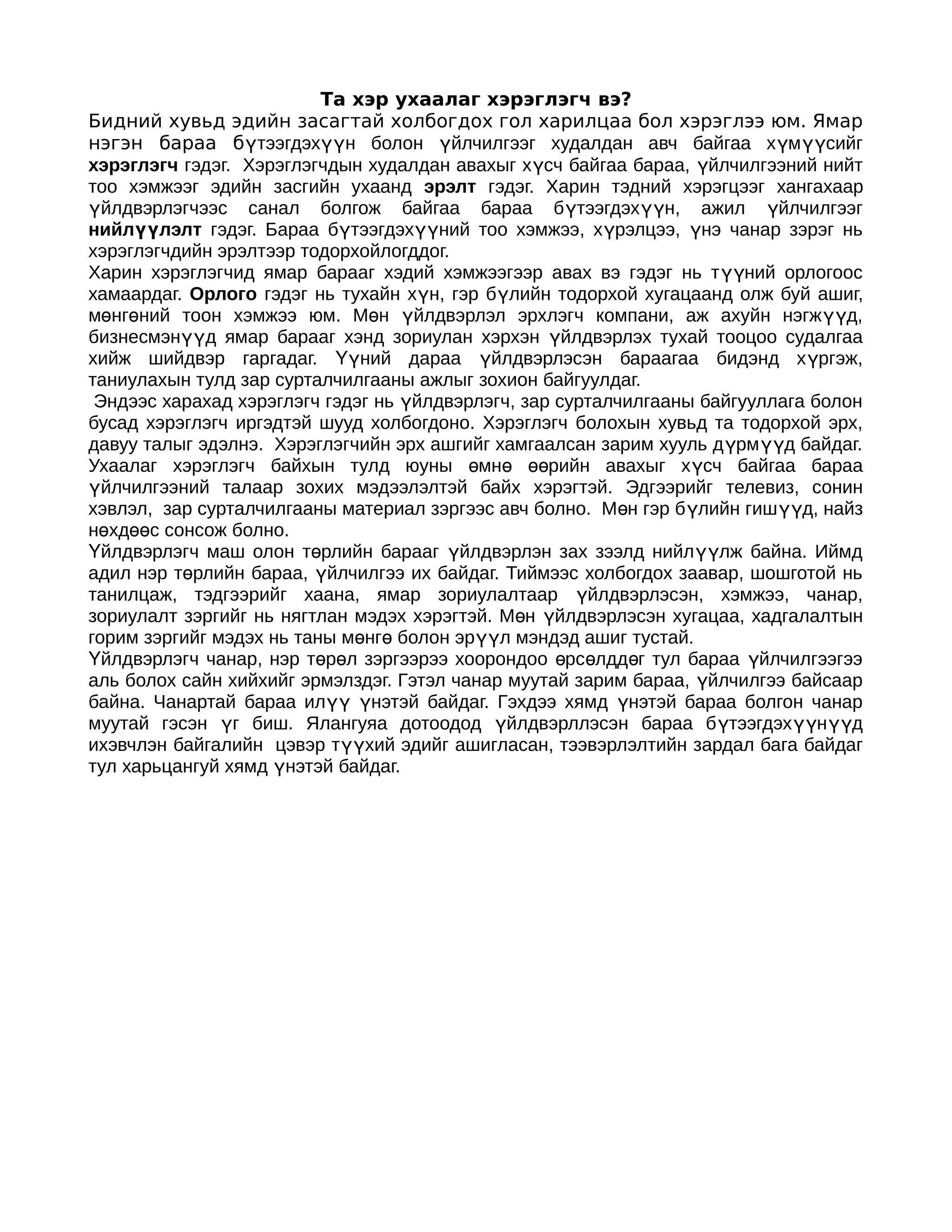 хэрэглэгч вэ? Бидний хувьд эдийн засагтай холбогдох гол харилцаа бол хэрэглээ юм. Ямар нэгэн бараа бүтээгдэхүүн болон үйлчилгээг худалдан авч байгаа хүм үүсийг хэрэглэгч гэдэг. Хэрэглэгчдын худалдан авахыг хүсч байгаа бараа, үйлчилгээний нийт тоо хэмжээг эдийн засгийн ухаанд эрэлт гэдэг. Харин тэдний хэрэгцээг хангахаар үйлдвэрлэгчээс санал болгож байгаа бараа бүтээгдэхүүн, ажил үйлчилгээг нийлүүлэлт гэдэг. Бараа бүтээгдэхүүний тоо хэмжээ, хүрэлцээ, үнэ чанар зэрэг нь хэрэглэгчдийн эрэлтээр тодорхойлогддог. Харин хэрэглэгчид ямар барааг хэдий хэмжээгээр авах вэ гэдэг нь т үүний орлогоос хамаардаг. Орлого гэдэг нь тухайн хүн, гэр бүлийн тодорхой хугацаанд олж буй ашиг, мөнгөний тоон хэмжээ юм. Мөн үйлдвэрлэл эрхлэгч компани, аж ахуйн нэгж үүд, бизнесмэнүүд ямар барааг хэнд зориулан хэрхэн үйлдвэрлэх тухай тооцоо судалгаа хийж шийдвэр гаргадаг. Үүний дараа үйлдвэрлэсэн бараагаа бидэнд х үргэж, таниулахын тулд зар сурталчилгааны ажлыг зохион байгуулдаг. Эндээс харахад хэрэглэгч гэдэг нь үйлдвэрлэгч, зар сурталчилгааны байгууллага болон бусад хэрэглэгч иргэдтэй шууд холбогдоно. Хэрэглэгч болохын хувьд та тодорхой эрх, давуу талыг эдэлнэ. Хэрэглэгчийн эрх ашгийг хамгаалсан зарим хууль д үрм үүд байдаг. Ухаалаг хэрэглэгч байхын тулд юуны өмнө өөрийн авахыг хүсч байгаа бараа үйлчилгээний талаар зохих мэдээлэлтэй байх хэрэгтэй. Эдгээрийг телевиз, сонин хэвлэл, зар сурталчилгааны материал зэргээс авч болно. М өн гэр б үлийн гиш үүд, найз нөхдөөс сонсож болно. Үйлдвэрлэгч маш олон төрлийн барааг үйлдвэрлэн зах зээлд нийл үүлж байна. Иймд адил нэр төрлийн бараа, үйлчилгээ их байдаг. Тиймээс холбогдох заавар, шошготой нь танилцаж, тэдгээрийг хаана, ямар зориулалтаар үйлдвэрлэсэн, хэмжээ, чанар, зориулалт зэргийг нь нягтлан мэдэх хэрэгтэй. Мөн үйлдвэрлэсэн хугацаа, хадгалалтын горим зэргийг мэдэх нь таны мөнгө болон эрүүл мэндэд ашиг тустай. Үйлдвэрлэгч чанар, нэр төрөл зэргээрээ хоорондоо өрс өлдд өг тул бараа үйлчилгээгээ аль болох сайн хийхийг эрмэлздэг. Гэтэл чанар муутай зарим бараа, үйлчилгээ байсаар байна. Чанартай бараа илүү үнэтэй байдаг. Гэхдээ хямд үнэтэй бараа болгон чанар муутай гэсэн үг биш. Ялангуяа дотоодод үйлдвэрллэсэн бараа б үтээгдэх үүн үүд ихэвчлэн байгалийн цэвэр түүхий эдийг ашигласан, тээвэрлэлтийн зардал бага байдаг тул харьцангуй хямд үнэтэй байдаг.