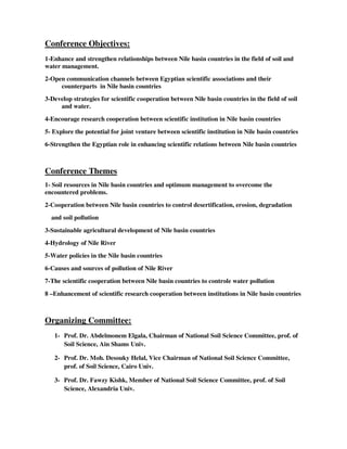 The document announces an international conference on sustainable development of soil and water resources in Nile Basin countries to be held in Cairo from April 16-19, 2016. The conference aims to enhance cooperation between Nile Basin countries in soil and water management, encourage research collaboration, and strengthen Egypt's role in scientific relations. It will include themes on soil resources, desertification control, agricultural development, hydrology, water policies, and pollution of the Nile River. Field trips related to Egyptian agriculture, antiquities and tourism will also be organized.