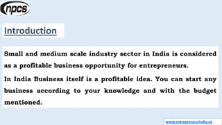 This document provides a list and brief descriptions of 25 small and medium scale business opportunities in India. It includes opportunities such as poultry farming, leather garments, biscuit making, cement production, e-waste recycling, thermocole product manufacturing, tea processing, and others. For each opportunity, it provides a short excerpt describing the relevant industry and feasibility as a business venture. The document aims to help entrepreneurs identify profitable small business ideas in India. It also includes contact information for the website providing further details on project reports.