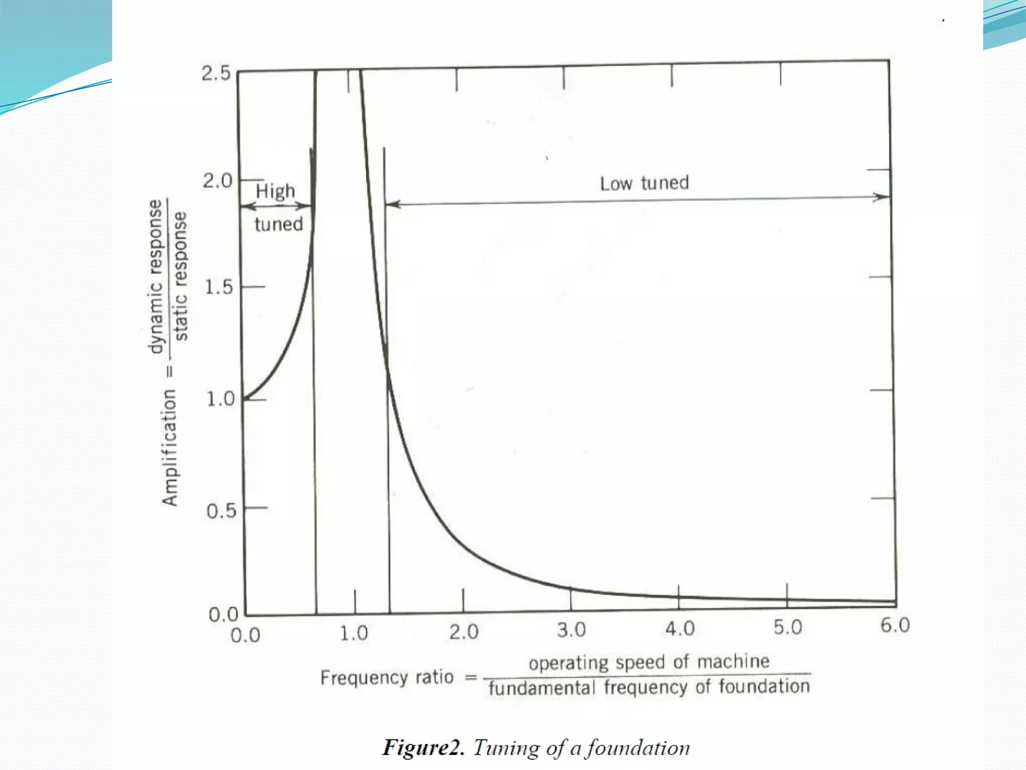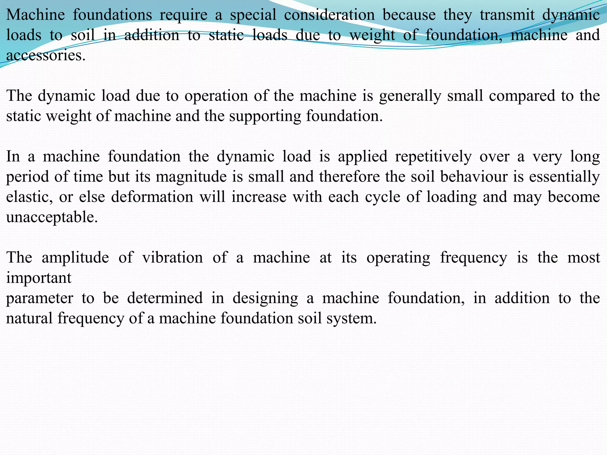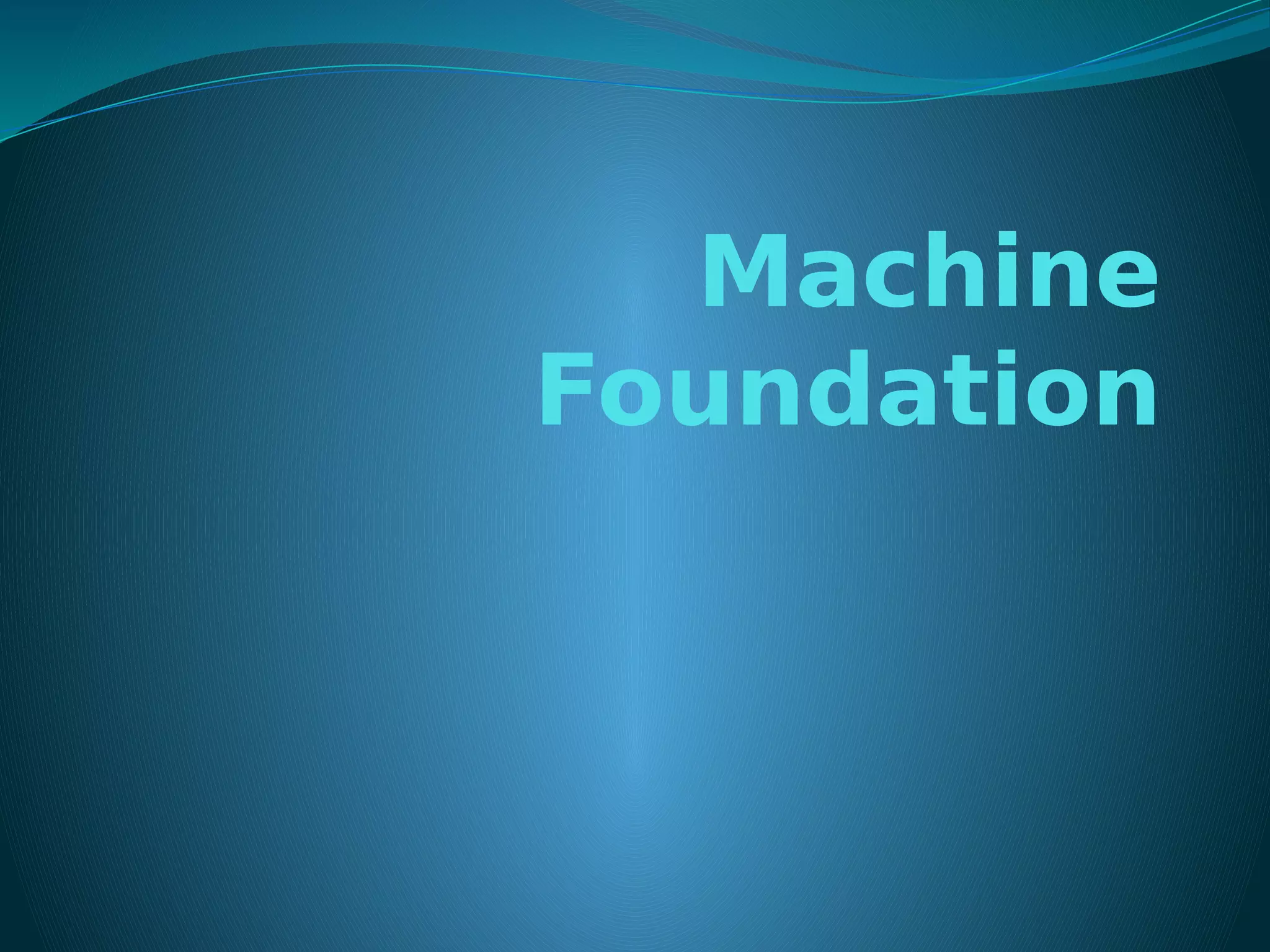 Machine foundations require consideration of both static and dynamic loads. Dynamic loads from machine operation are generally small but are applied repetitively over long periods of time. The natural frequency of the machine-foundation-soil system needs to avoid resonance with the operating frequency. Foundations can be analyzed using discrete mass-spring models, with the soil represented by a spring and optionally a dashpot to model damping. The elastic half-space and linear elastic weightless spring methods allow calculating the soil spring constants and damping values for foundation design and analysis.
