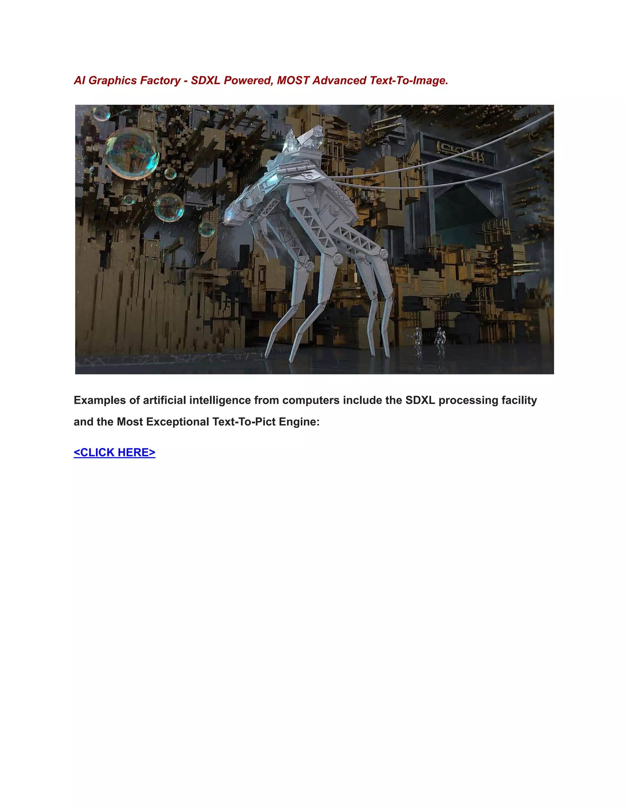 The document discusses a product called 'AI Graphics Factory - SDXL Powered', which is a text-to-image generation tool utilizing advanced AI technologies. It notes that detailed information about this product may not be available as of September 2021, and encourages readers to seek up-to-date information online. The tool is suggested to be useful for rapidly creating visual content for various purposes, including marketing and creative projects.