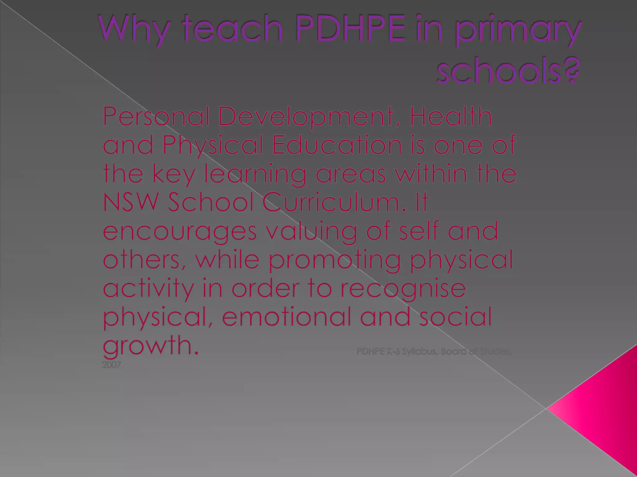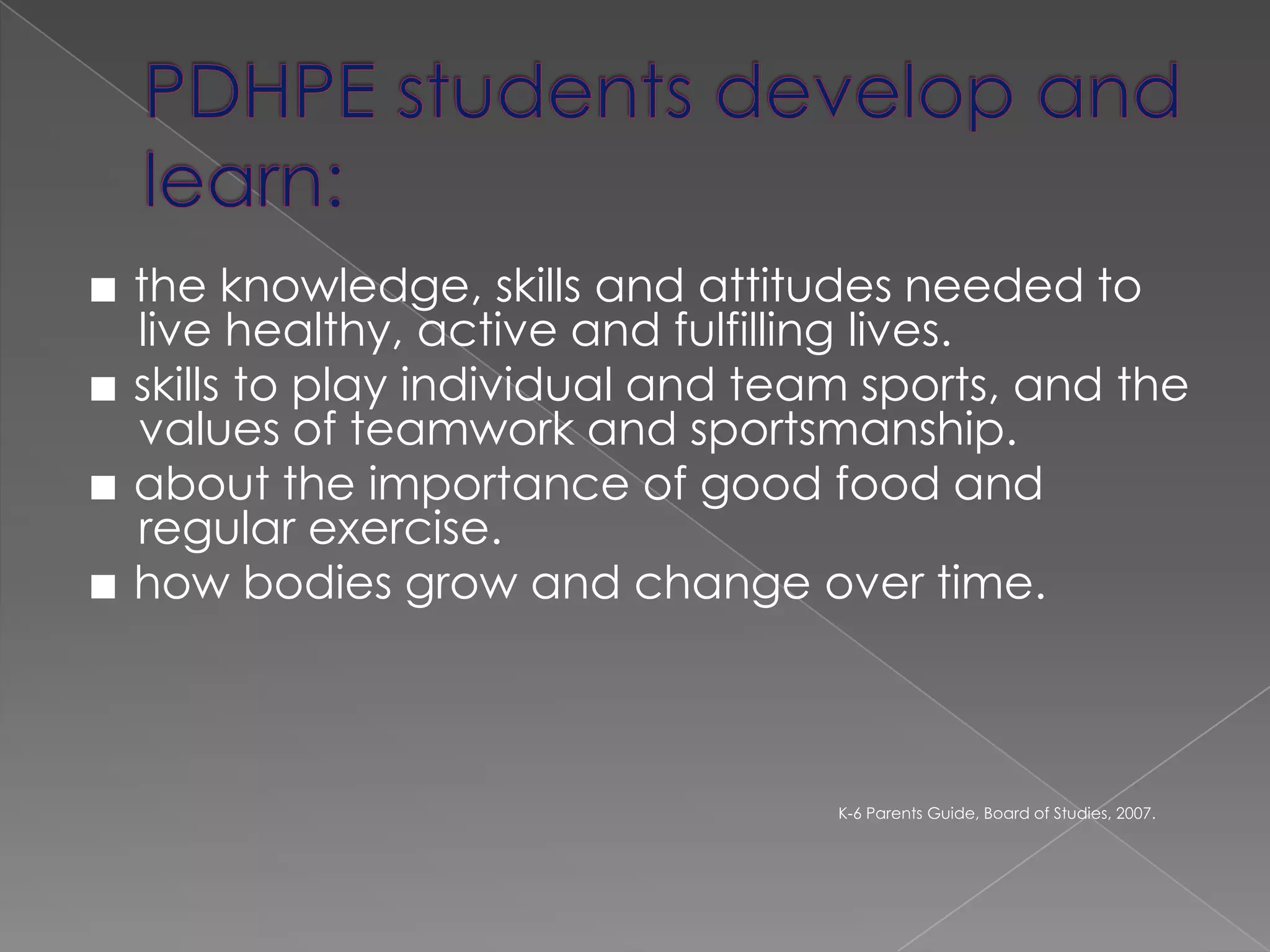 The document outlines the key areas covered in the personal development, health and physical education (PDHPE) K-6 syllabus in NSW, Australia. It discusses how the syllabus teaches students about living a healthy, active lifestyle and developing interpersonal skills. It also covers topics like growth and development, safe living, personal health choices, and decision making. The overall goal is for students to develop healthy habits and socially just values through PDHPE.