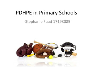 PDHPE (Personal Development, Health and Physical Education) is one of the six key learning areas in the Primary school curriculum. It helps students develop important skills like communication, decision making, interaction, movement, and problem solving. PDHPE teaches students outcomes such as active lifestyles, dance, games, growth and development, gymnastics, relationships, health choices, and safe living. Students benefit from PDHPE through a better understanding of health and fitness, new friendships, improved decision making, and promotion of healthy living and safety.