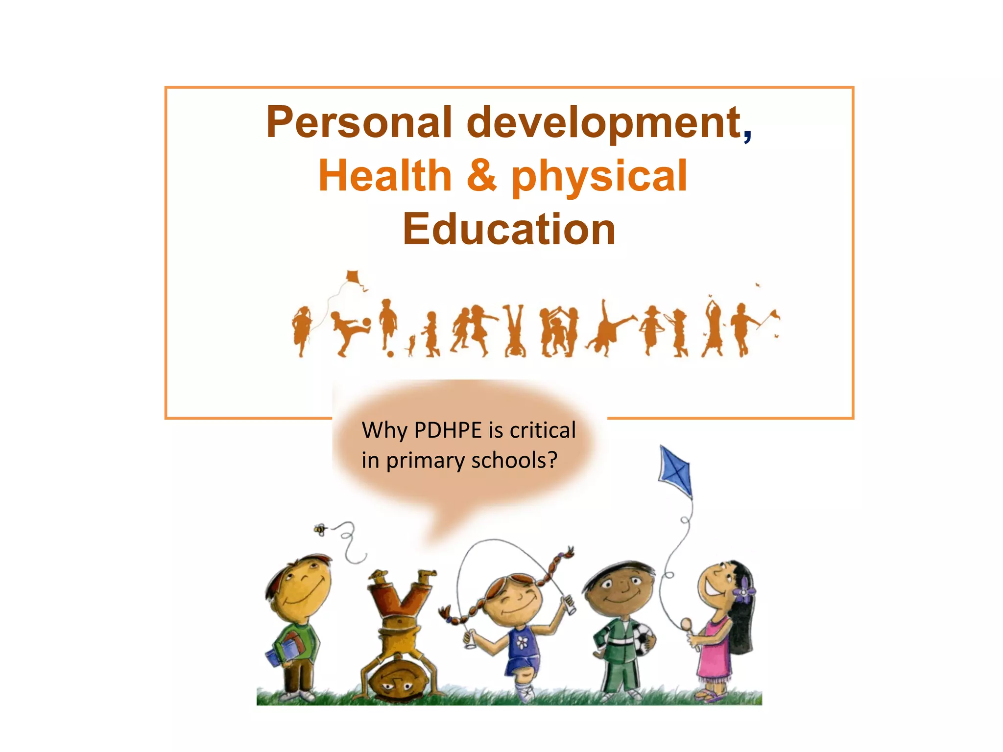 PDHPE (Personal Development, Health and Physical Education) is critical in primary schools for several key reasons. It promotes healthy and active lifestyles by encouraging physical activity and nutrition. This supports students' physical development and helps them gain self-awareness and social values. Research also shows that physically active students perform better academically and exhibit positive classroom behaviors. The PDHPE syllabus additionally helps students develop lifelong decision making, problem solving, communication, and interpersonal skills. While physical activity levels and education are declining, PDHPE plays an important role in addressing this by making health a priority in children's schooling.