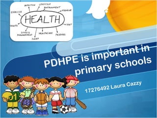 PDHPE stands for Personal development, health, and physical education. It is an important part of a child's education as it promotes healthy lifestyles and decision making. PDHPE helps children make informed lifestyle choices, understand personal health factors, encourages healthy and active habits, and teaches them to value themselves and others. It incorporates topics like interpersonal relationships, growth, sports, dance, lifestyle choices and more. While only 19% of Australian children get the recommended daily physical activity, PDHPE is valuable as it allows children to develop lifelong skills and understand their capabilities beyond just physical education.