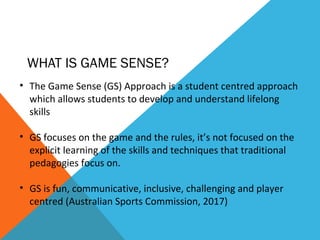The Game Sense (GS) approach is a student-centered pedagogy for teaching physical education and sports. It focuses on playing games and learning skills through participation rather than explicit instruction. Key aspects of the GS approach include using modified games of increasing complexity, small group work, and inquiry-based learning. The approach is inclusive and caters to varying abilities. It allows students to develop tactical thinking and learn through discovery rather than being told techniques. The GS approach aligns with outcomes in the NSW K-6 physical education curriculum by helping students enjoy physical activity, develop fundamental movement skills, and learn cooperation through participation in modified games and sports.