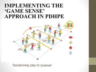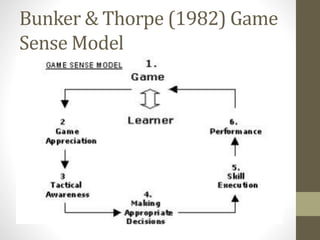 The document discusses the Game Sense model of coaching developed by Bunker and Thorpe. Game Sense focuses on developing decision making and problem solving skills through modified games. It emphasizes inclusive and developmentally appropriate gameplay over strict rules and winning. Research shows Game Sense improves skills, tactics, teamwork and engagement compared to traditional coaching focused on performance and instruction. The pedagogy aligns with constructivist learning theories and developing qualities outlined in physical education syllabi.