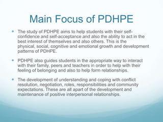 PDHPE is important for promoting healthy lifestyles and physical activity in kids. It also encourages self-understanding and understanding of others. The main focus of PDHPE is to help students develop self-confidence, self-acceptance, and the ability to act in their own and others' best interests through physical, social, cognitive, and emotional growth. PDHPE also guides students on how to build positive relationships and make good health and safety decisions.