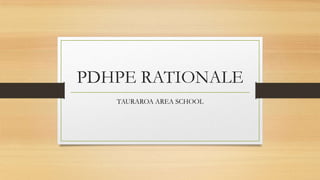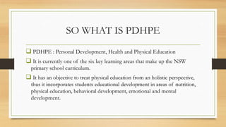 PDHPE aims to develop students' personal, physical, social, and emotional growth through physical education, nutrition education, and lessons on interpersonal relationships, decision making, and healthy lifestyle choices. It incorporates movement skills, health decisions, forming relationships, and developing a sense of well-being and community. The curriculum covers dance, gymnastics, games, growth, active lifestyle, and safe living through communication, problem solving, movement, interaction, and decision making skills.