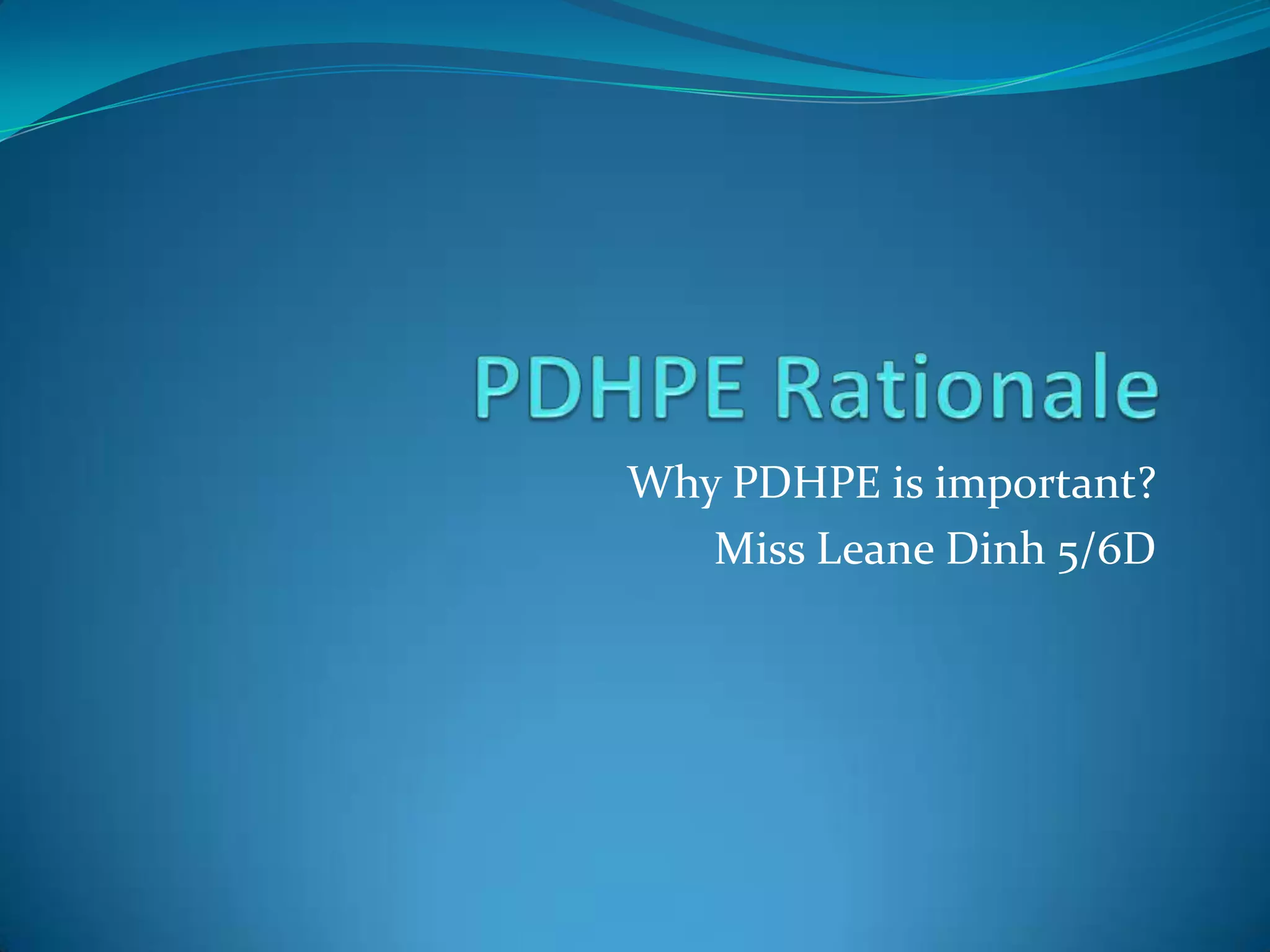 PDHPE (Personal Development, Health and Physical Education) is an important subject for students. Currently, over 25% of Australian school-aged children are overweight or obese, and physical activity levels in schools have been declining. PDHPE provides many benefits to students' overall well-being by improving physical and emotional health, ensuring physical development, and increasing the likelihood of maintaining healthy habits into adulthood. It is more than just physical activity, as it also focuses on personal development, health awareness, values, attitudes, and understanding. Promoting the importance of PDHPE requires effort from parents, students, and teachers to make it an enjoyable part of students' lives.