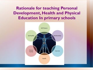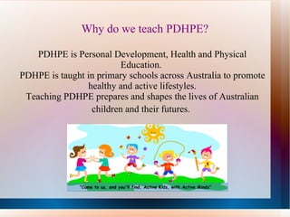 PDHPE is taught in primary schools across Australia to promote healthy and active lifestyles among children and shape their futures. Through studying areas like sports, dance, and personal health choices, PDHPE helps students develop knowledge, skills, and attitudes to lead fulfilling lives. It benefits students physically, mentally, socially and emotionally by helping them understand themselves and their peers while encouraging a healthy lifestyle and decision making skills.