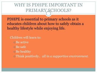 PDHPE in primary schools teaches children how to develop and maintain a healthy lifestyle. It focuses on developing physical skills and fitness through games and sports. It also educates students on making safe and healthy choices regarding their well-being, environment, diet, substance use, and developing positive attitudes and resilience. The overall goal is to provide a supportive environment for children to safely learn skills that will benefit their physical, social, and emotional development.