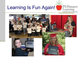 PA Distance Learning Charter School is a public cyber charter school that provides online education to students in grades K-12. It uses an interactive online curriculum aligned to PA state standards and taught by highly qualified teachers. Students have access to live online classes, communication tools, and technical support. The school aims to engage students through independent and group work, projects, and virtual interaction with peers and teachers. It offers remediation, acceleration, and special programs like art, music, special education, ESL, and Title I to help students succeed. The enrollment process involves completing an online application and submitting required documents.
