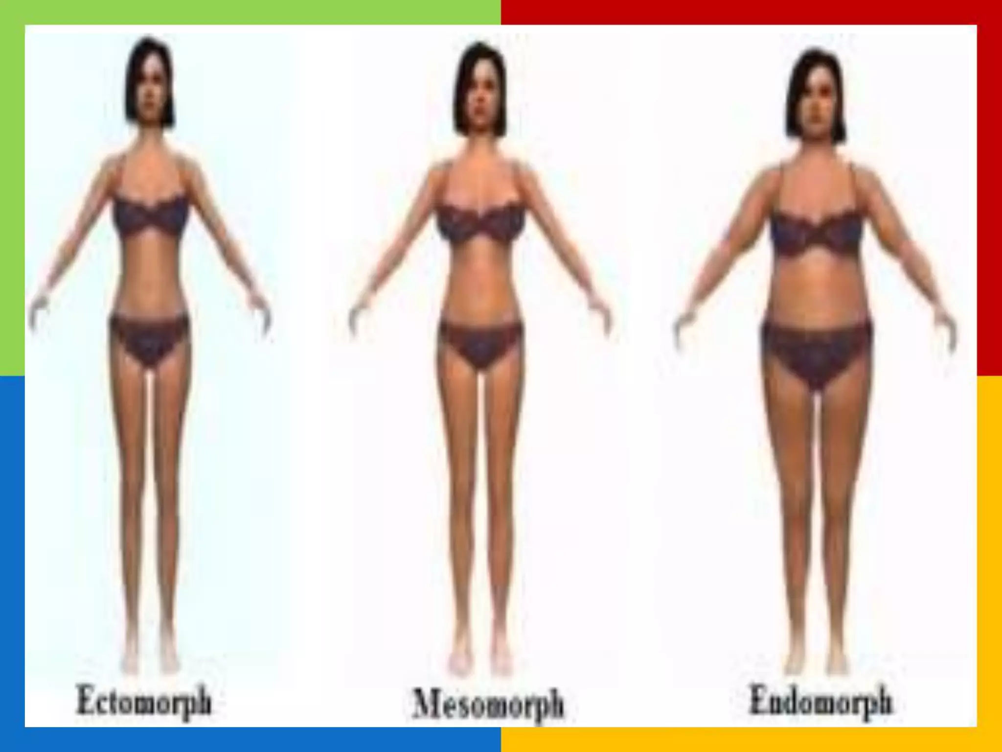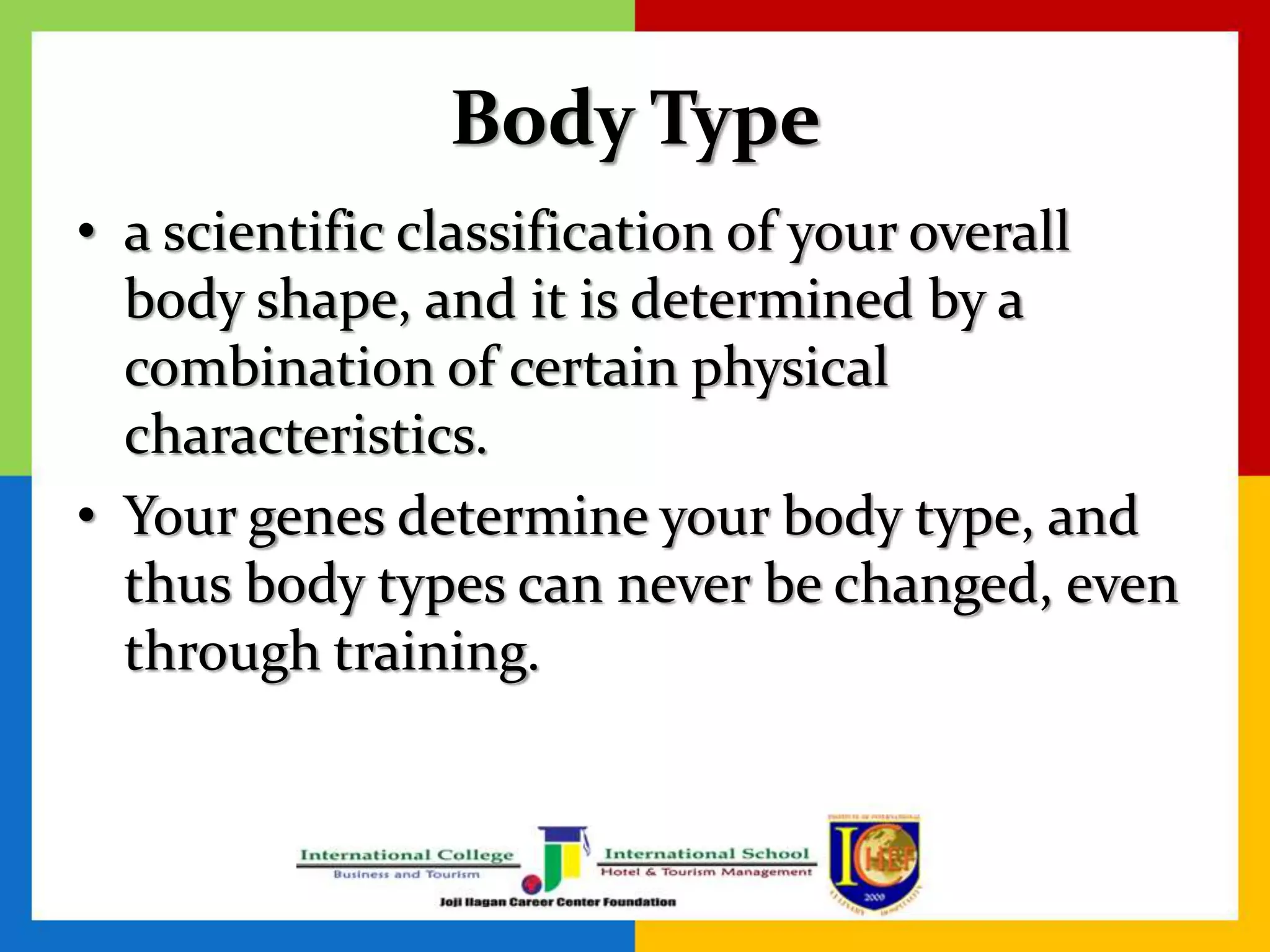 There are three main body types - endomorph, mesomorph, and ectomorph - determined by genetics. Endomorphs have larger bones and more body fat, mesomorphs have broad shoulders and lean muscle mass, and ectomorphs have a thin linear build. Mesomorphs tend to have an easier time controlling their weight due to a fast metabolism. In addition, there are five classifications of body shapes - V-shape, hourglass, apple, pear, and rectangle - defined by the proportions of the upper and lower body sections.