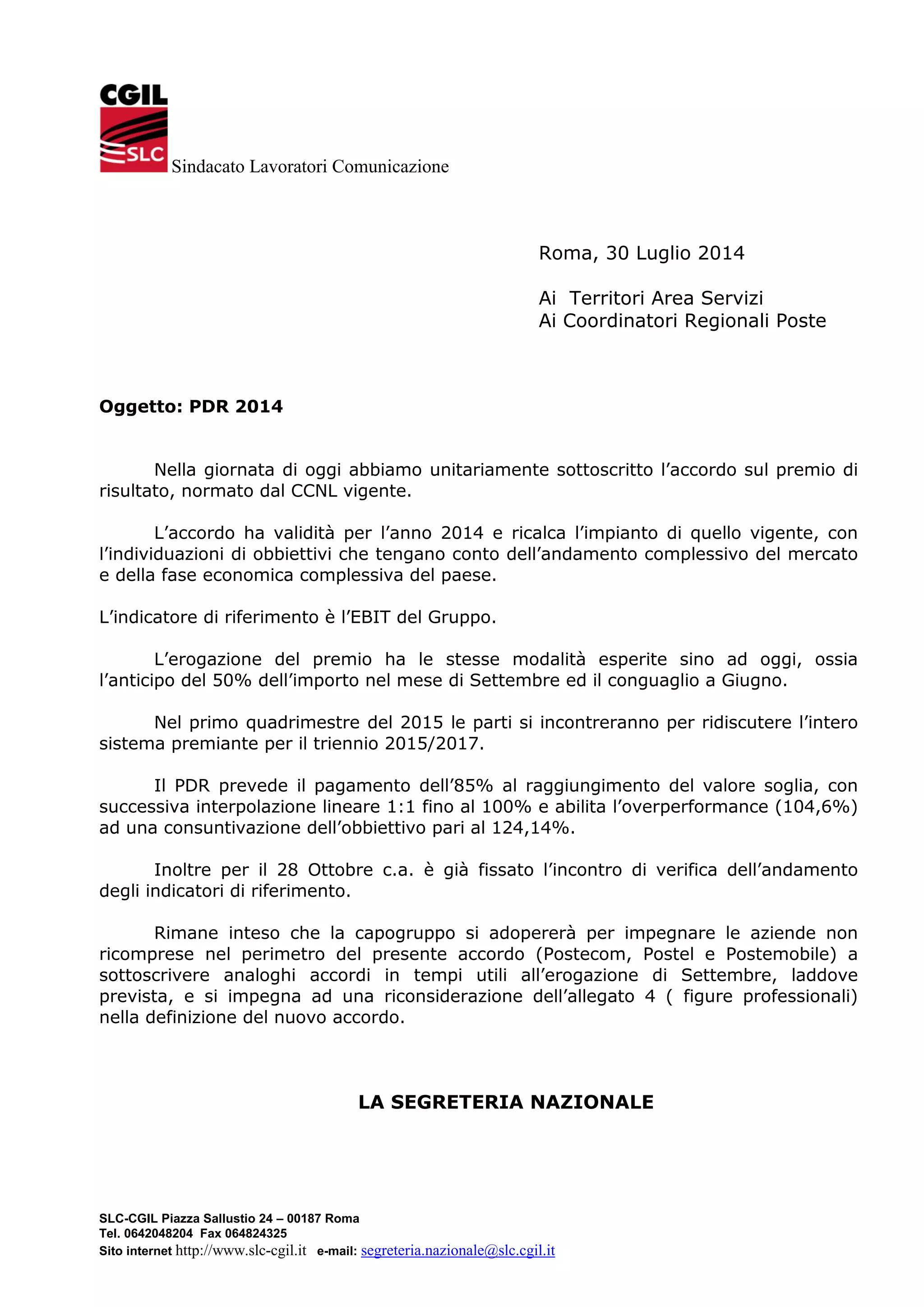 Il 30 luglio 2014 è stato sottoscritto un accordo sul premio di risultato per il 2014, basato sul ccnl vigente e sull'andamento di mercato, con l'ebit come indicatore di riferimento. Il premio sarà erogato con un anticipo del 50% a settembre e un conguaglio a giugno, con il 85% pagato al raggiungimento del valore soglia e possibilità di overperformance. Un incontro è previsto per il 28 ottobre per verificare gli indicatori, e si sta cercando di estendere accordi simili ad altre aziende non comprese nell'accordo attuale.