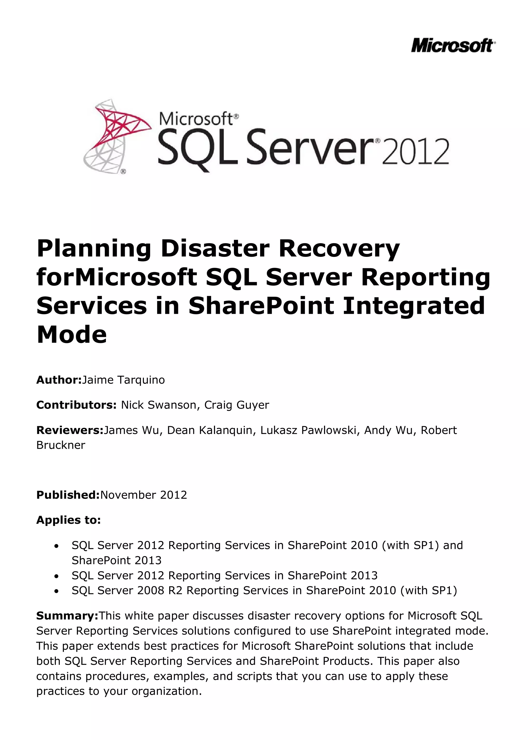 This document provides guidance on planning disaster recovery for SQL Server Reporting Services deployments configured in SharePoint integrated mode. It discusses the key components to consider, including the Reporting Services databases, SharePoint synchronization, SQL Server Agent jobs, and scale-out architectures. The document separately addresses disaster recovery planning for SQL Server 2008 R2 and 2012 Reporting Services, outlining the components, example failover processes, and known limitations for each version. The goal is to help extend an organization's SharePoint disaster recovery plan to also cover Reporting Services solutions integrated with SharePoint.