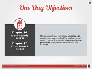 The document outlines mixed-methods and action research designs taught at the Faculty of Psychology, Universitas Katolik Indonesia Atma Jaya during the 2014/2015 semester. It explains the characteristics, types, and procedures involved in mixed-methods research, highlighting the importance of integrating both quantitative and qualitative data to enhance understanding of research problems. Various design types, including convergent, explanatory sequential, exploratory sequential, and embedded designs, are discussed along with their specific applications and benefits.