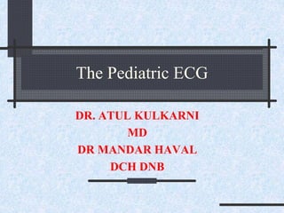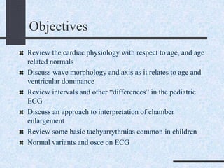 The ECG shows a pattern of right ventricular hypertrophy with a large R wave in lead V1 and deep S wave in lead V6, suggesting enlarged right ventricle. This, along with the juvenile T wave pattern of inverted T waves in the precordial leads from birth to age 8, are consistent with the normal developmental changes described in the document as the left ventricle increases in dominance from birth through childhood. The document provides an overview of normal pediatric ECG patterns and intervals across age groups as well as common arrhythmias and abnormalities.