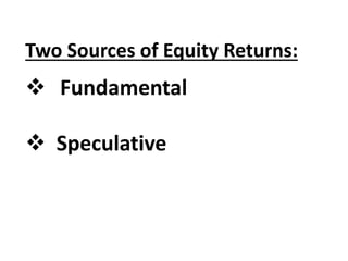 There are two sources of equity returns: fundamental and speculative. Fundamental returns come from earnings and dividends. Speculative returns arise from changes in the market's valuation of a company's performance and profitability prospects. A company's stock price is determined by multiplying its earnings per share by its price-to-earnings ratio. The total return from holding a stock is the sum of the fundamental return from earnings and any return from expansion or contraction of the price-to-earnings multiple assigned by the market.
