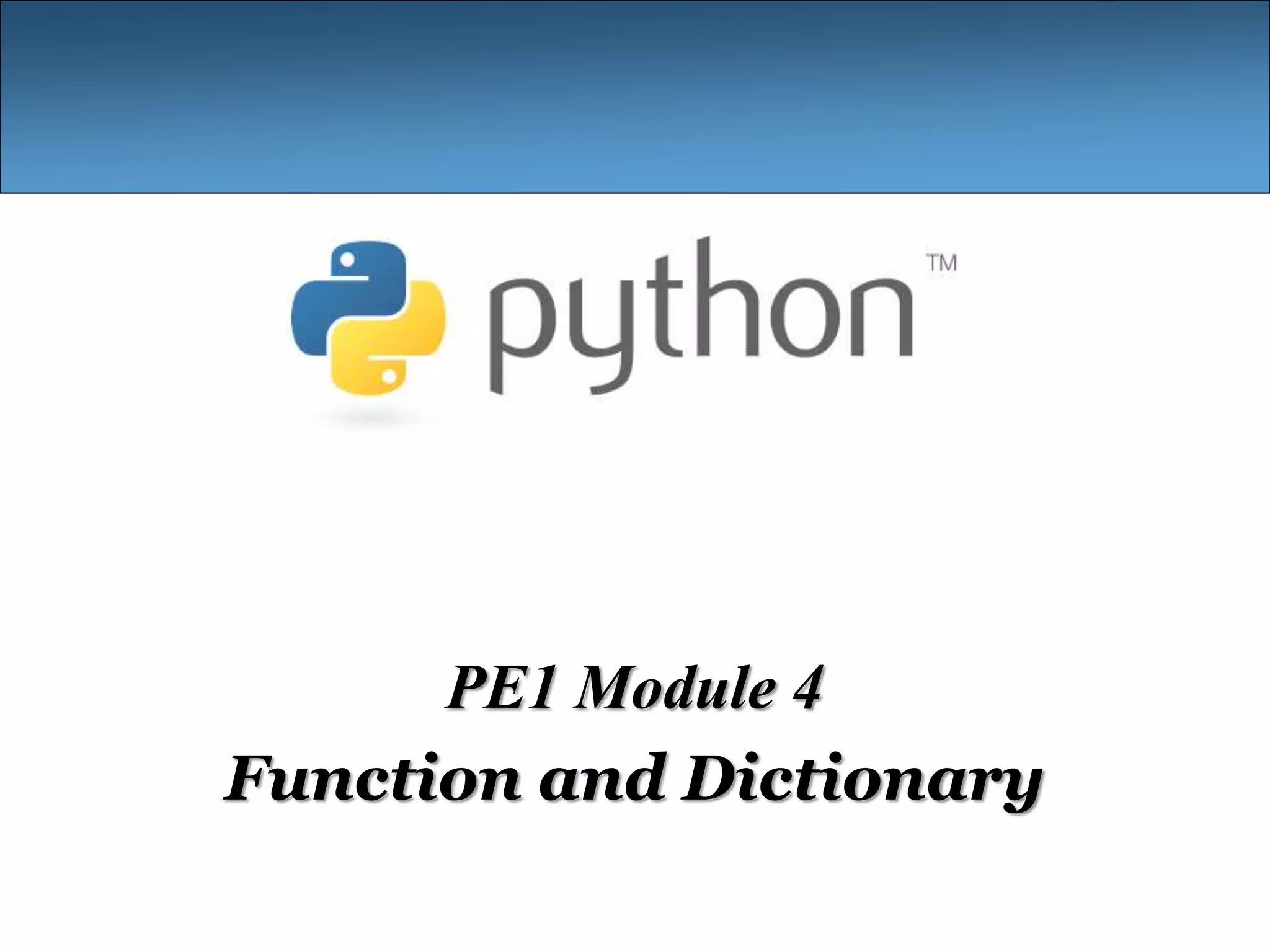 This document provides an overview of functions and dictionaries in Python. It defines a function as reusable block of code that takes arguments, performs computations, and returns a result. Functions provide modularity and code reusability. The document outlines how to define functions using the def keyword, pass arguments, return values, and call functions. It also discusses function scopes, default argument values, and that functions without a return statement return None. The document then defines dictionaries as mutable containers that store key-value pairs, and describes how to access, update, and delete dictionary elements. It notes some properties of dictionary keys including no duplicate keys and that keys must be immutable. Finally, it lists some built-in functions and methods for working with dictionaries