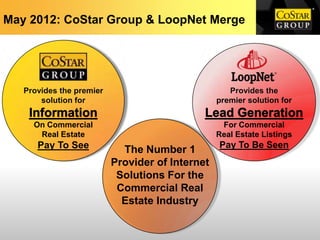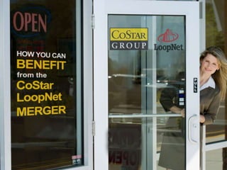 CoStar Group acquired LoopNet, combining to become the largest provider of commercial real estate data and marketing services. The merger combines LoopNet's large online marketplace with CoStar's extensive research team and property database tracking over 3 million commercial properties. CoStar users now have access to significantly more listings for sale, lease, and other property types in major markets like Chicago than previous LoopNet premium members due to CoStar's larger inventory of researched property data.
