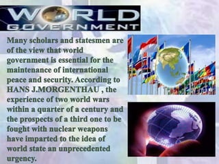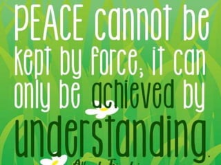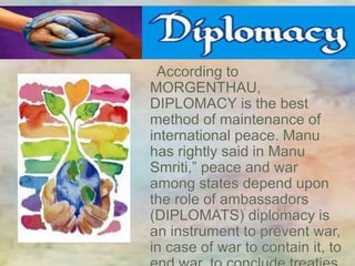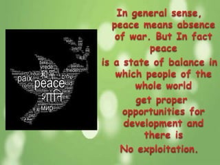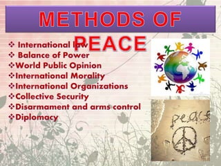 International peace can be maintained through several methods including balance of power, international law, international organizations, collective security, international morality, and disarmament and arms control. Balance of power involves preventing any single state from becoming too powerful. International law and organizations like the United Nations help codify rules and bring states together to resolve issues peacefully. Collective security and international morality establish norms to discourage aggression and promote cooperation. Disarmament aims to reduce arms and the risk of conflict.