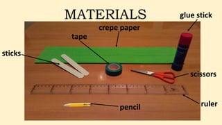 This document provides instructions for making peace pompons out of paper and sticks. The instructions are divided into 9 steps: measure and cut paper, fold paper in half and again, cut paper into strips, glue a stick to one side of the folded paper, wrap the paper strips around the stick and glue them into place, and finish by taping the paper securely to the stick to complete the pompon.