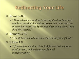 The document provides scripture passages about redirecting one's life according to God's will. It discusses areas that may need pruning or positive influences. It encourages maintaining faith and a spirit-filled attitude, even when facing difficult situations, and focusing on obeying God rather than exalting oneself.
