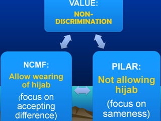This document discusses Catholic education in Mindanao and its role in peacebuilding. It notes that textbooks underrepresent or misrepresent Mindanao, reflecting economic marginalization. It also discusses how public land laws and resettlement displaced indigenous and Muslim populations. While education aimed to integrate groups, it failed to mitigate tensions and was seen as imposing a Manila-centered identity. There is a need for educational institutions to acknowledge their role in historical marginalization and support minority rights to build peace. The hijab issue at a Catholic school is presented as a learning opportunity for dialogue and understanding difference while avoiding discrimination.