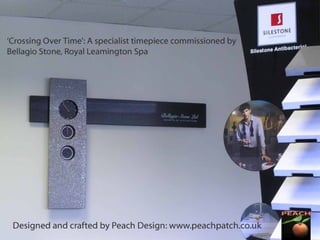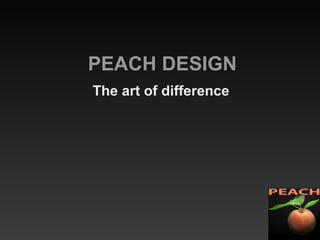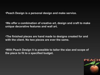 Peach Design is a personal design service that creates unique, handmade decorative wall art and features for both domestic and commercial clients. The pieces are customized to fit the client's specifications and budget. The design process involves sketches, drawings, and prototypes that are approved by the client before production begins using materials like ceramics, wood, glass, metal and stone. Installation is also supervised to ensure no damage is done to existing structures.