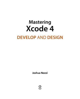 This document provides information about the book "Mastering Xcode 4: Develop and Design" by Joshua Nozzi. It was published by Peachpit Press in 2012 and covers using Xcode 4 to develop applications for iOS and Mac OS X. The book includes chapters on using the Xcode interface, creating user interfaces, adding and managing files in a project, writing and debugging code, and using the data model editor. It is intended to help readers master the development tools and workflows in Xcode 4.