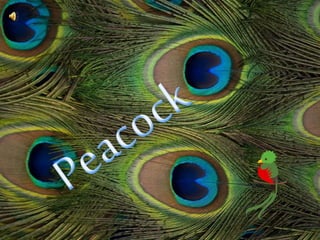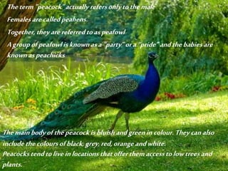 Peafowl are birds that include peacocks and peahens. Peacocks are the male birds known for their colorful tail feathers, which can span up to 6 feet. Peafowl live in areas with low trees and plants, eat a variety of foods like grains and small animals, and peacocks will fan out their tails and display their colors to attract mates and assert dominance.