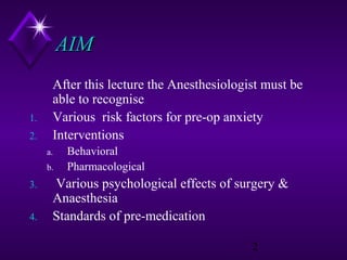 1. Various risk factors for pre-op anxiety in children and interventions like behavioral and pharmacological approaches.