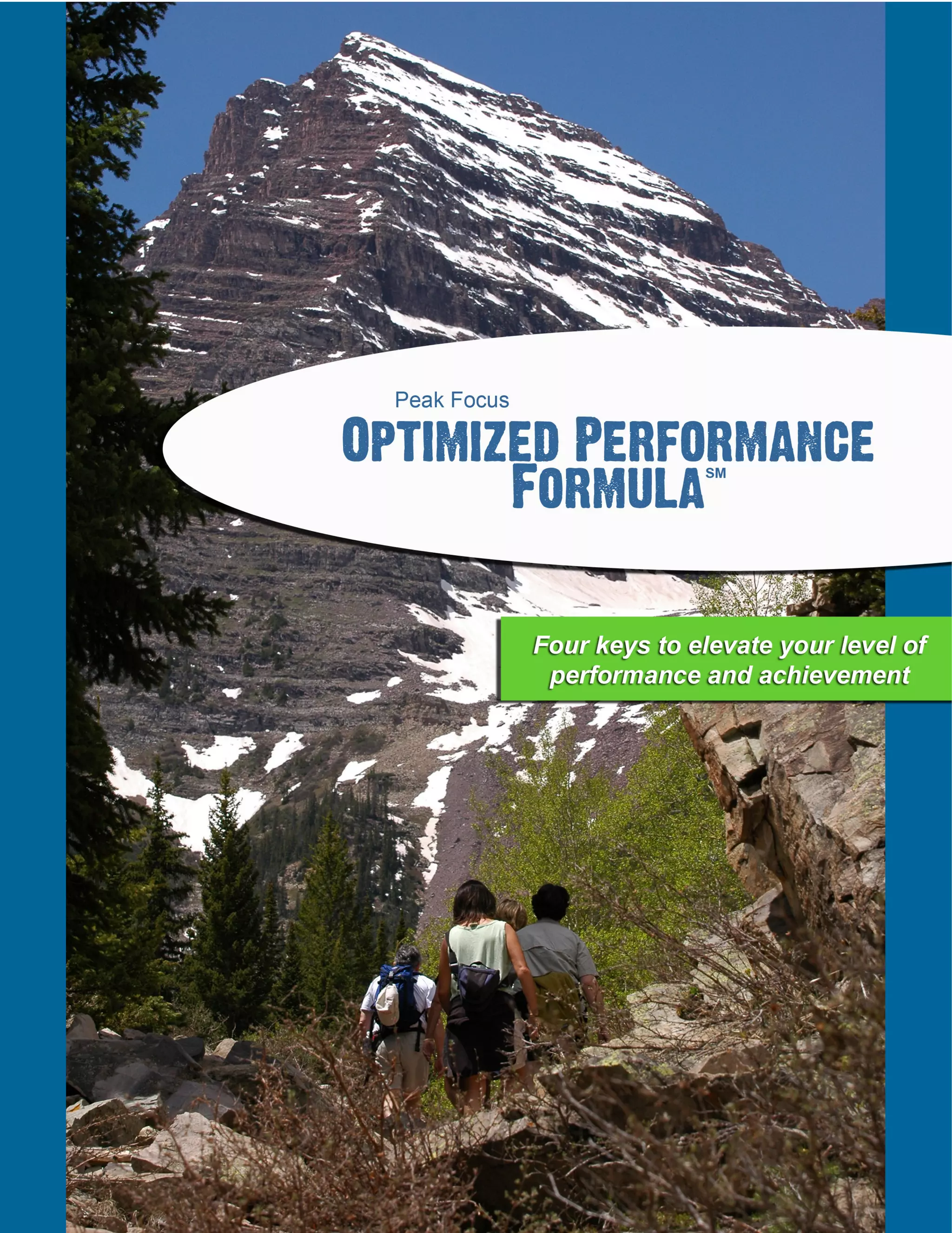 The document introduces the Peak Focus Optimized Performance Formula, emphasizing the importance of the components: ability, activity, aim, and passion in achieving optimized performance. It discusses the concept of continuous improvement through small, incremental changes and highlights how passion can exponentially enhance performance outcomes. Additionally, it provides tools for assessment and guidance for individuals and teams looking to elevate their levels of effectiveness.