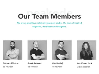 Peakode is a mobile app development studio based in Bursa, Turkey. They develop both consumer and enterprise mobile apps for iOS and Android. The document provides details on Peakode's team, services, project process, and examples of apps they have developed for clients in various industries including delivery, healthcare, travel, and more. It also shares information on their growth timeline and international customer base.
